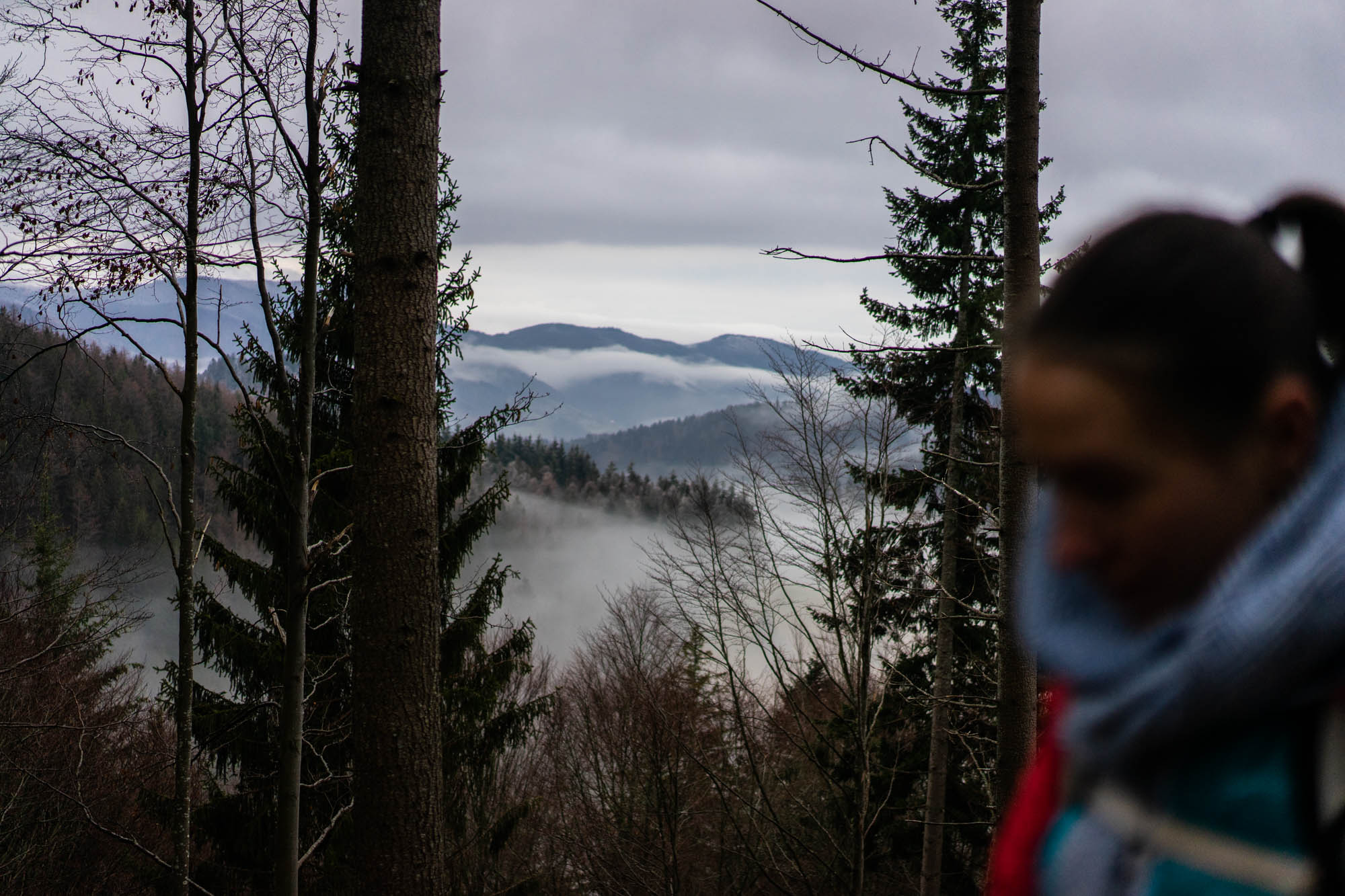 Der Weg startete wirklich sehr entspannt – ein sich durch den Wald windender Pfad mit leichter Steigung. Der Nebel verzog sich sogar ein wenig, aber wir konnten immer noch Nebelschwaden zwischen den Bäumen wabern sehen. Nach kurzer Zeit schon kamen wir zu einer Lichtung, von der aus wir einen tollen Blick über die Täler hatten. Wir hatten die tief hängenden Wolken schon unter uns gelassen und sahen nun die sanften Berge des Schwarzwalds und vereinzelte Dörfer. Die riesigen Windräder, die hier so häufig auf den Gipfeln zu sehen sind, wirkten fast ein wenig bedrohlich in dieser unheimlichen Herbststimmung. Über uns war eine zweite Schicht von Nebel und es war schwer zu erahnen, was sich wohl darüber verbergen mag.