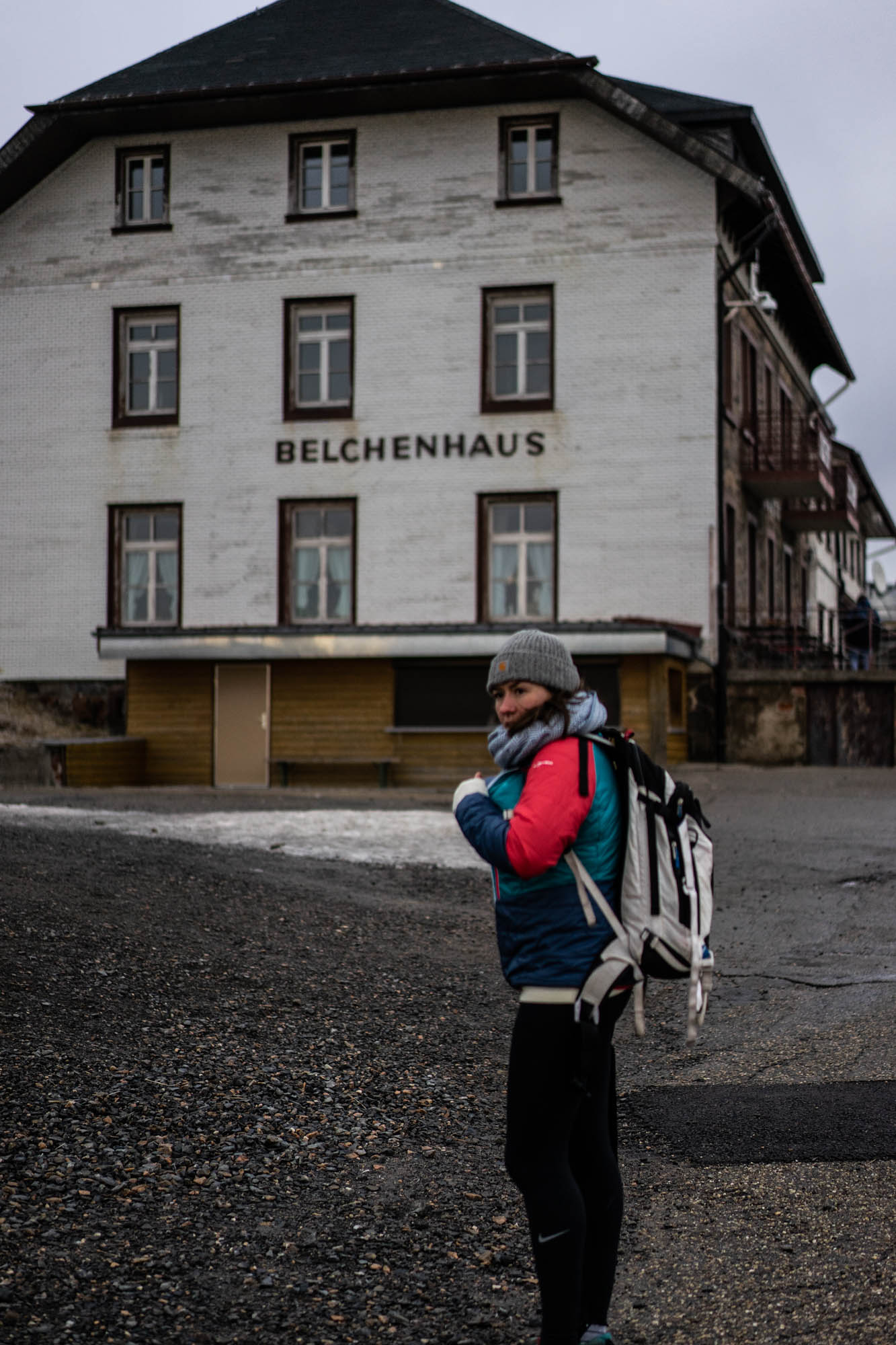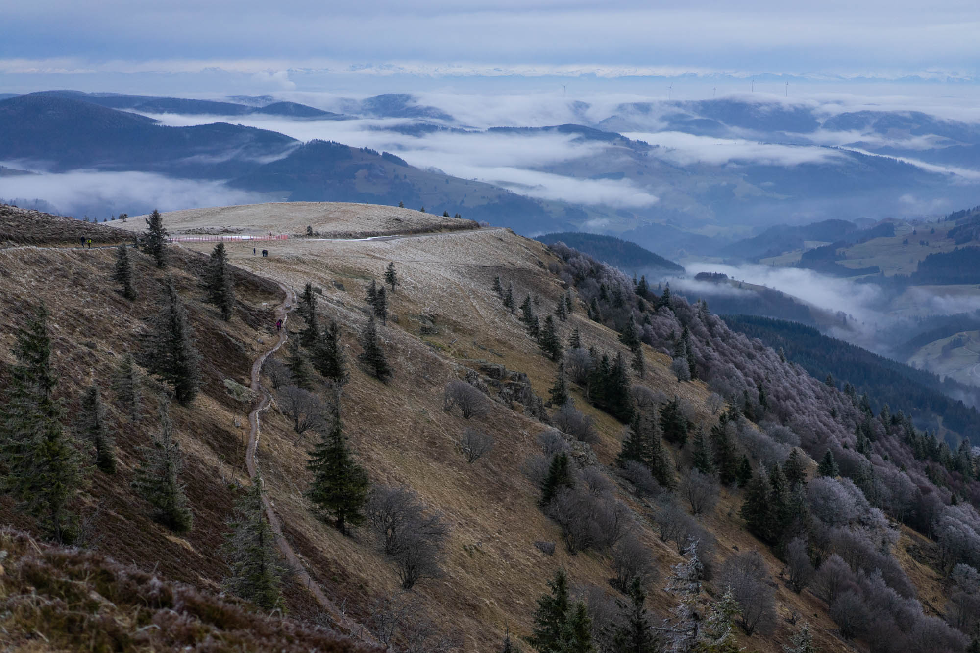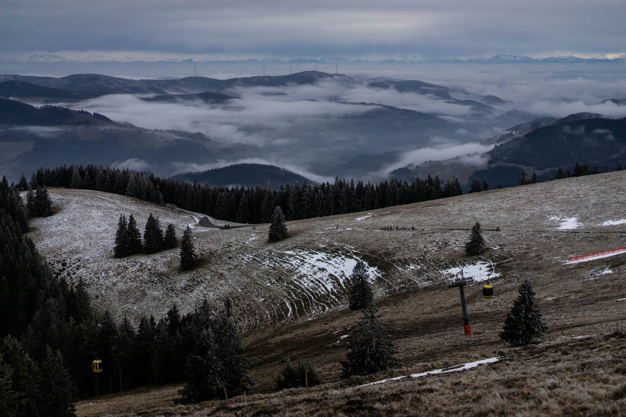 Nach ein paar hundert Metern über rutschige Wurzeln erreichten wir das Belchenhaus, nahe der Bergstation. Hier oben waren erstaunlich wenig Leute und mit der tierstehenden Sonne ergab sich eine spooky Stimmung. Ich hab es sehr genossen und hätte gerne länger hier verweilt, aber die Kälte trief uns weiter, denn unsere Finger schmerzten sogar in den Handschuhen.