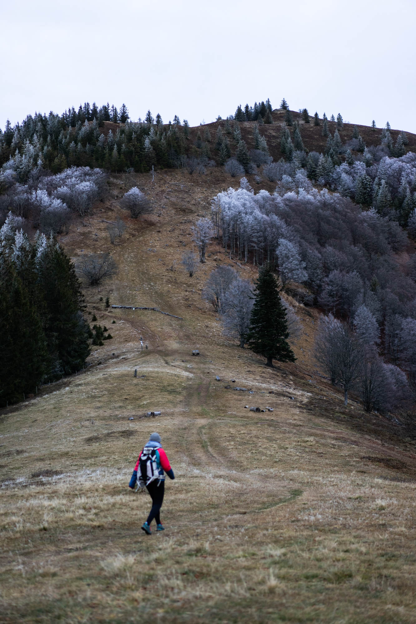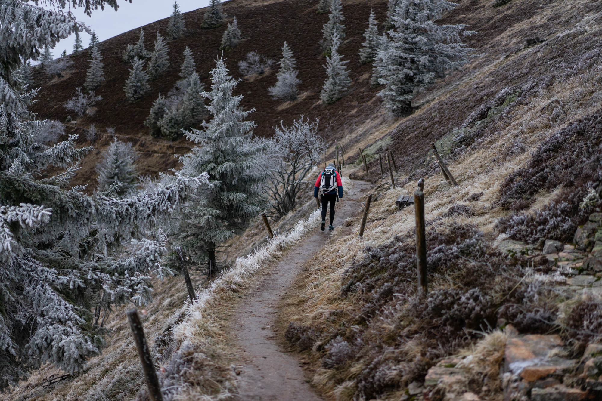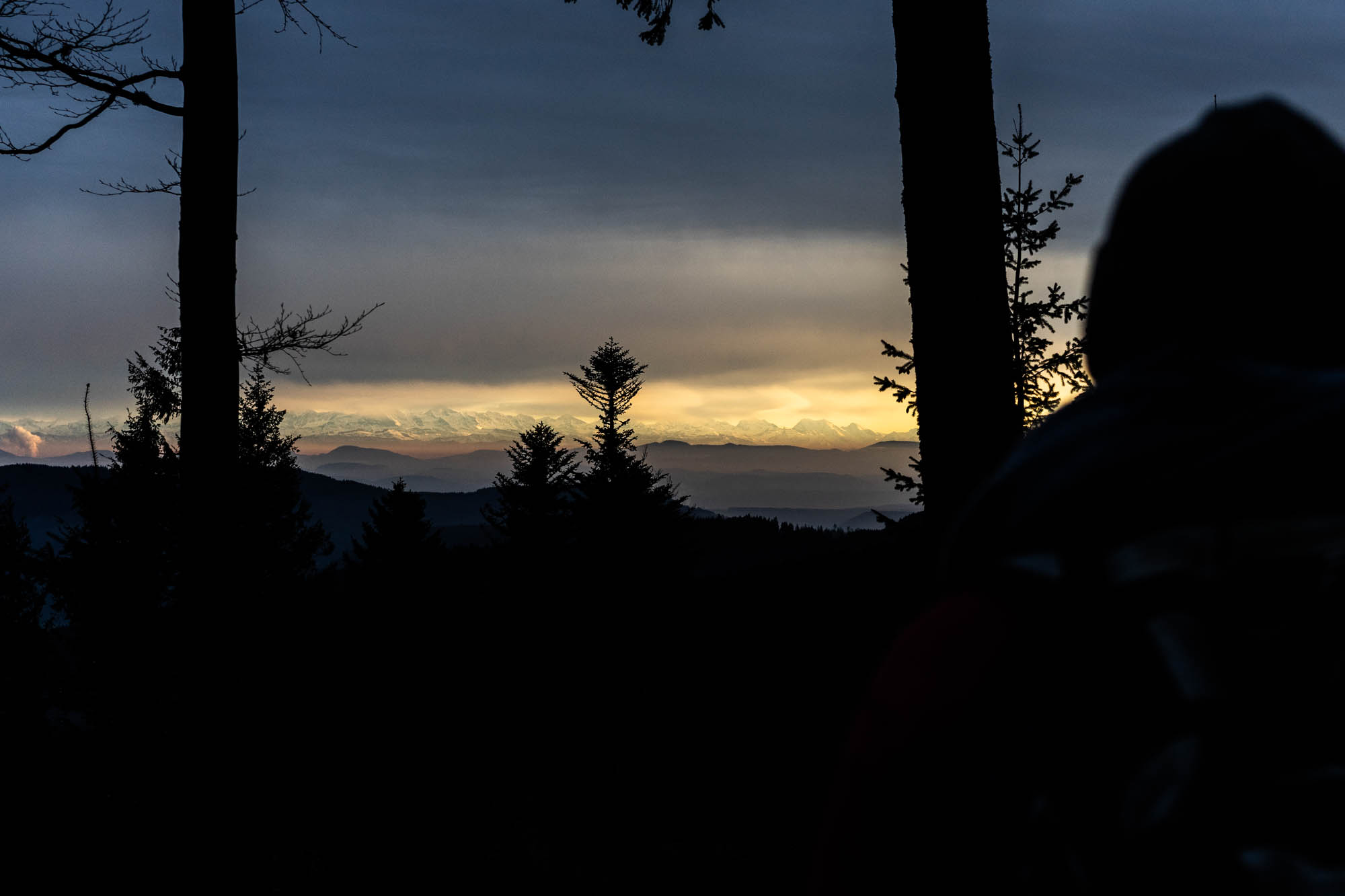 Nach ein paar hundert Metern über rutschige Wurzeln erreichten wir das Belchenhaus, nahe der Bergstation. Hier oben waren erstaunlich wenig Leute und mit der tierstehenden Sonne ergab sich eine spooky Stimmung. Ich hab es sehr genossen und hätte gerne länger hier verweilt, aber die Kälte trief uns weiter, denn unsere Finger schmerzten sogar in den Handschuhen.