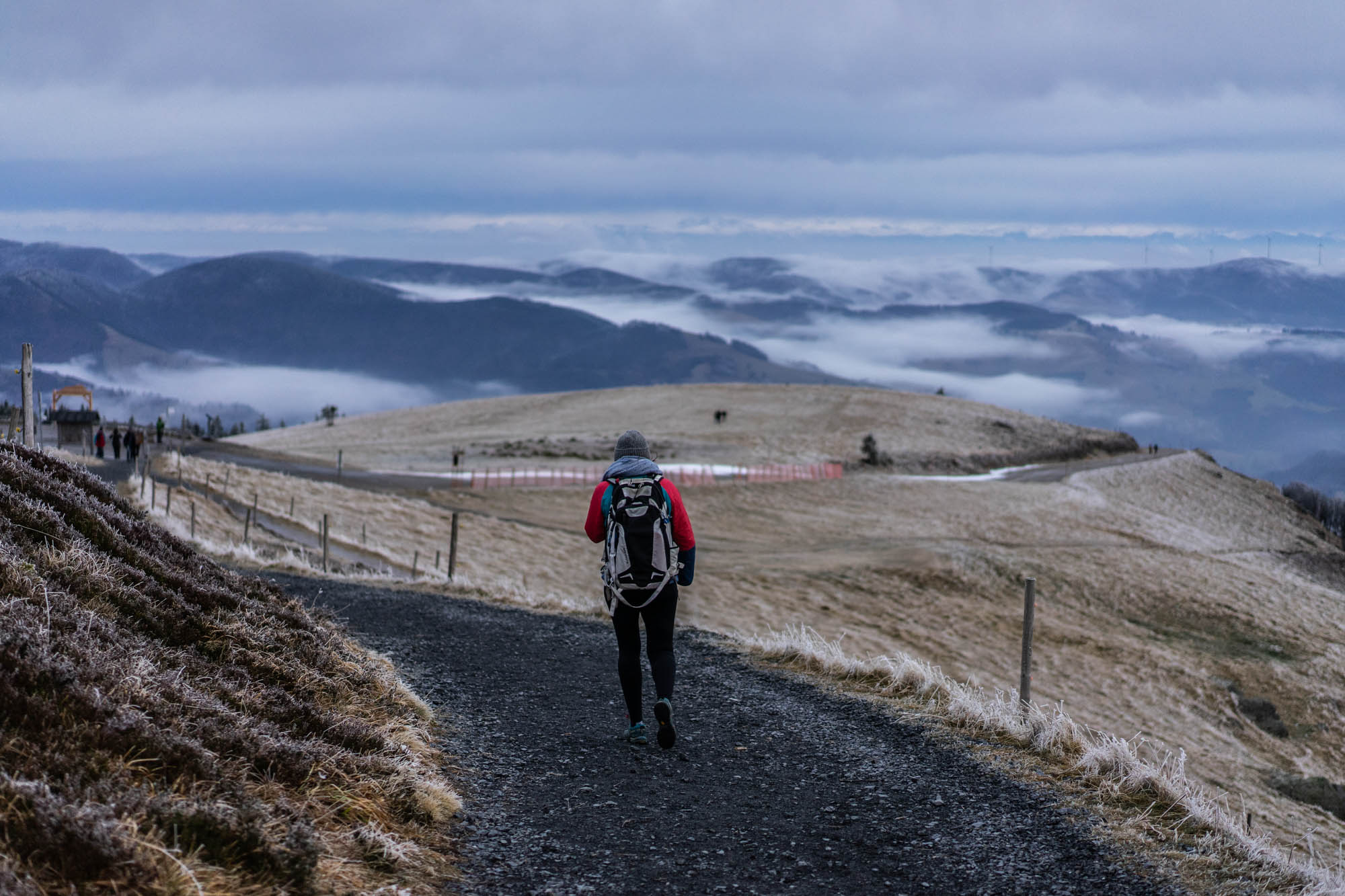 Es waren nur noch etwa zehn Minuten bis zu dem flachen Gipfel. Wir folgten dem Rundweg, der uns in einem großen Bogen zuerst nach oben brachte und dann zurück runter zum Belchenhaus brachte. Auf dem Gipfel machen wir nur ein paar Fotos und packten unsere Sandwiches aus, die wir dann aber doch lieber auf dem Weg runter aßen, denn wir waren definitiv zu ausgefroren um länger hier oben zu bleiben.